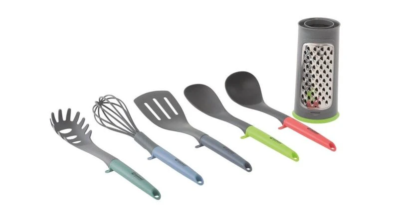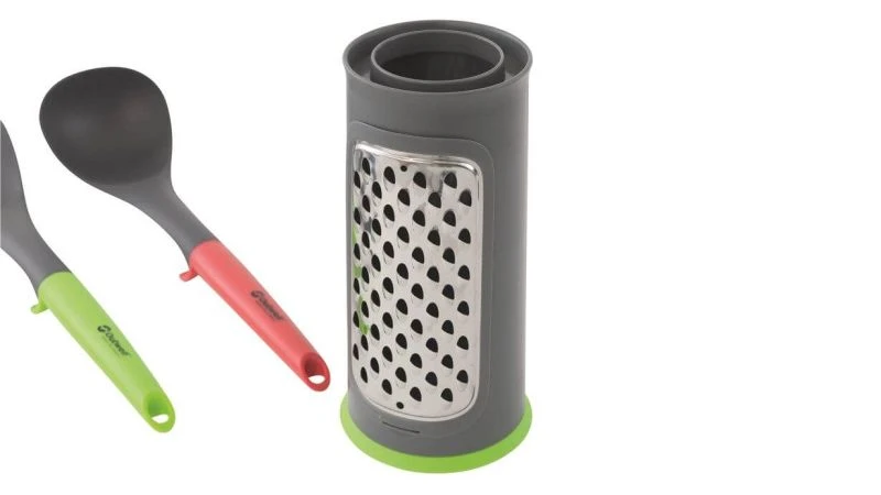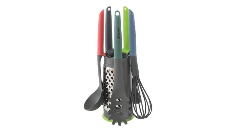 The ‘Adana’ utensil set from Outwell features easy-grip handles in bright colours. A five-piece set which stands doubles as a grater – organised and convenient. A great addition to your kitchen.