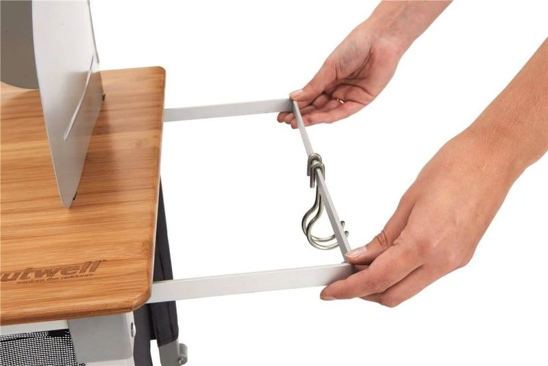 The Outwell Padres Kitchen Table in a stylish two-tone fabric with a solid bamboo table top, featuring three handy hooks on one side and a storage pocket on the other. The kitchen table includes a ‘pull-out’ holder for a washing bowl or rubbish bag, and a windshield to protect burner flames. Ideal for your camping cooking!